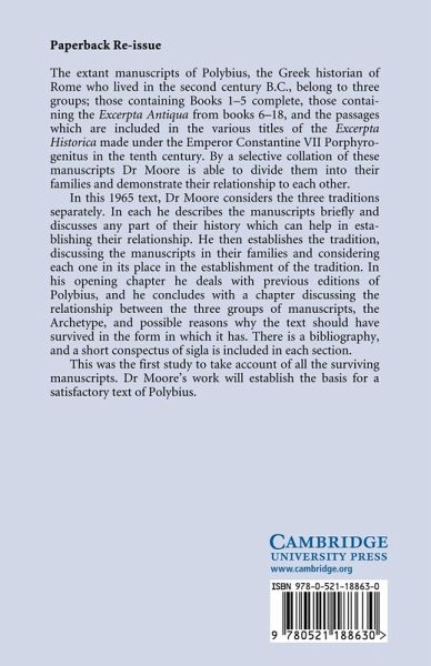 In this 1965 text, Dr Moore divides the extant manuscripts of Polybius, the Greek historian of Rome who lived in the second century BC, into their families, and demonstrates their relationship to each other. He considers the three traditions separately, and in each he describes the manuscripts briefly and discusses any part of their history which can help in establishing their relationship. He then establishes the tradition, discussing the manuscripts in their families and considering each one in its place in the establishment of the tradition. In his opening chapter he deals with previous editions of Polybius, and he concludes with a a chapter discussing the relationship between the three groups of manuscripts, the Archetype, and possible reasons why the text should have survived in the form in which it has. This was the first study to take account of all the surviving manuscripts.