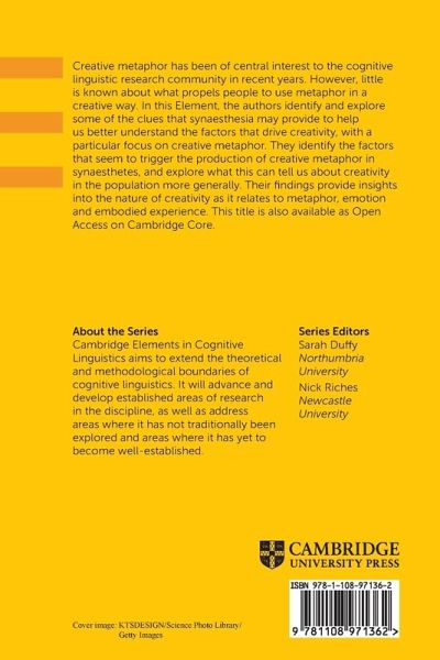 In this Element, the authors compare the written descriptions of sensory and emotional experiences produced by twenty synaesthetes and twenty non-synaesthetes, and explore the characteristics of their writing, particularly as they relate to metaphor. This title is also available as Open Access on Cambridge Core.