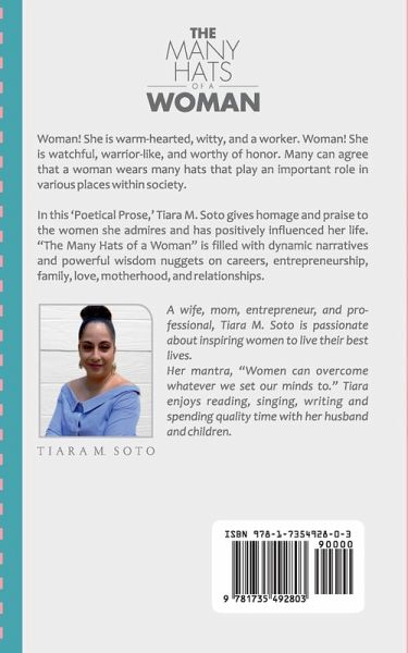 Woman! She is warm-hearted, witty, and a worker. Woman! She is watchful, warrior-like, and worthy of honor. Many can agree that a woman wears many hats that play an important role in various places within society. In this 'Poetical Prose, ' Tiara M. Soto gives homage and praise to the women she admires and has positively influenced her life. "The Many Hats of a Woman" is filled with dynamic narratives and powerful wisdom nuggets on careers, entrepreneurship, family, love, motherhood, and relationships.