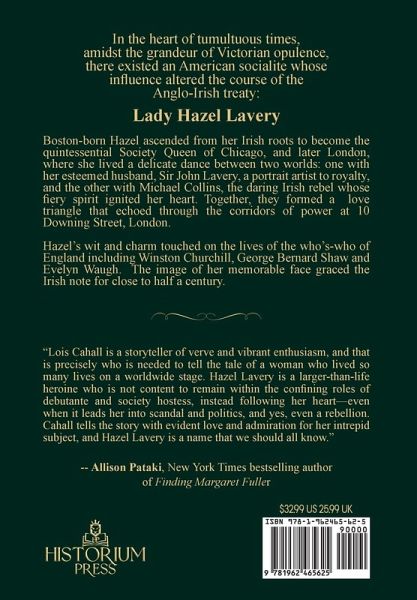 In the heart of tumultuous times, amidst the grandeur of Victorian opulence, there existed an American socialite whose influence altered the course of the Anglo-Irish treaty: Lady Hazel Lavery Boston-born Hazel ascended from her Irish roots to become the quintessential Society Queen of Chicago, and later London, where she lived a delicate dance between two worlds: one with her esteemed husband, Sir John Lavery, a portrait artist to royalty, and the other with Michael Collins, the daring Irish rebel whose fiery spirit ignited her heart. Together, they formed a love triangle that echoed through the corridors of power at 10 Downing Street, London. Hazel's wit and charm touched the lives of the who's who of England, including Winston Churchill, George Bernard Shaw, and Evelyn Waugh. The image of her memorable face graced the Irish note for close to half a century. ADVANCED PRAISE ⭐️⭐️⭐️⭐️⭐️ "Lois Cahall really knows how to write and tell a story. So, grab a copy of The Many Lives & Loves of Hazel Lavery; historical fiction at its best. It's based on Hazel's amazing story. In particular, a love triangle: Hazel, the English artist John Lavery, and the Irish renegade, Michael Collins. Both men love Hazel. You will, too." - James Patterson, NYT bestselling author ⭐️⭐️⭐️⭐️⭐️ "The Many Lives & Loves of Hazel Lavery sweeps the reader along in a riveting tale of thwarted desires, crushing duty, and inescapable destiny. Lois Cahall captures beautifully the echoes of past conflicts resonating anew." - Amanda Foreman, author of the prize-winning bestsellers, Georgiana, Duchess of Devonshire and A World on Fire: An Epic History of Two Nations Divided ⭐️⭐️⭐️⭐️⭐️ "Lois Cahall is a storyteller of verve and vibrant enthusiasm, and that is precisely who is needed to tell the tale of a woman who lived so many lives on a worldwide stage... Cahall tells the story with evident love and admiration for her intrepid subject, and Hazel Lavery is a name that we should all know." - Allison Pataki, NYT bestselling author of Finding Margaret Fuller ⭐️⭐️⭐️⭐️⭐️ "Far too little is known about Hazel Lavery, but that is about to be remedied thanks to Lois Cahall's intimate portrait of this fascinating woman... Cahall has mined real gold in this novel filled with meticulous research and a driving narrative. I was fascinated from beginning to end." - Renee Rosen, USA Today best-selling author, Let's Call Her Barbie