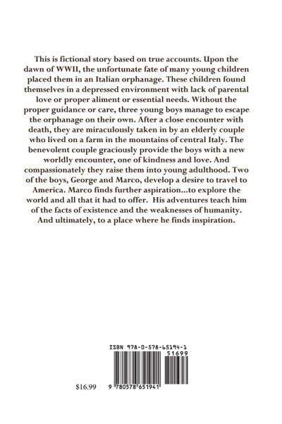 This is fictional story based on true accounts. Upon the dawn of WWII, the unfortunate fate of many young children placed them in an Italian orphanage. These children found themselves in a depressed environment with lack of parental love or proper aliment or essential needs. Without the proper guidance or care, three young boys manage to escape the orphanage on their own. After a close encounter with death, they are miraculously taken in by an elderly couple who lived on a farm in the mountains of central Italy. The benevolent couple graciously provide the boys with a new worldly encounter, one of kindness and love. And compassionately they raise them into young adulthood. Two of the boys, George and Marco, develop a desire to travel to America. Marco finds further aspiration...to explore the world and all that it had to offer. His adventures teach him of the facts of existence and the weaknesses of humanity. And ultimately, to a place where he finds inspiration.