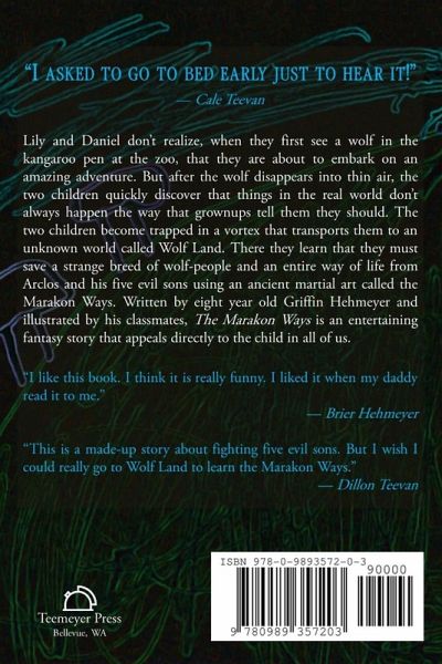 Lily and Daniel don't realize, when they first see a wolf in the kangaroo pen at the zoo, that they are about to embark on an amazing adventure. But after the wolf disappears into thin air, the two children quickly discover that things in the real world don't always happen the way that grownups tell them they should. Lily and Daniel become trapped in a vortex that transports them to an unknown world called Wolf Land. There they learn that they must save a strange breed of wolf-people and an entire way of life from Arclos and his five evil sons using an ancient martial art called the Marakon Ways. Written by eight year old Griffin Hehmeyer and illustrated by his classmates, The Marakon Ways is an entertaining fantasy story that appeals directly to the child in all of us.