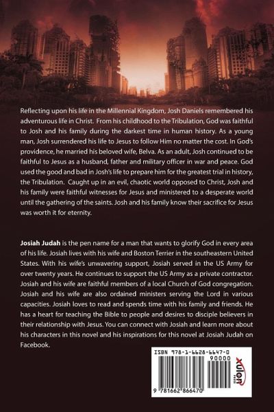 Reflecting upon his life in the Millennial Kingdom, Josh Daniels remembered his adventurous life in Christ. From his childhood to the Tribulation, God was faithful to Josh and his family during the darkest time in human history. As a young man, Josh surrendered his life to Jesus to follow Him no matter the cost. In God's providence, he married his beloved wife, Belva. As an adult, Josh continued to be faithful to Jesus as a husband, father and military officer in war and peace. God used the good and bad in Josh's life to prepare him for the greatest trial in history, the Tribulation. Caught up in an evil, chaotic world opposed to Christ, Josh and his family were faithful witnesses of Jesus ministering to a desperate world until the gathering of the saints. Josh and his family know their sacrifice for Jesus was worth it for eternity. Josiah Judah is the pen name for a man that wants to glorify God in every of his life. Josiah lives with his wife and Boston terrier in the southeastern United States. With his wife's unwavering support, Josiah served in the US Army for over twenty years. He continues to support the US Army as a private contractor. Josiah and his wife are faithful members of a local Church of God. Josiah and his wife are also ordained ministers serving the Lord in various capacities. Josiah loves to read and spends time with his family and friends. He has a heart for teaching the Bible to people and desires to disciple believers in their relationship with Jesus. You can connect with Josiah and learn more about his characters in this novel and his inspirations for the his novel on his Facebook page,