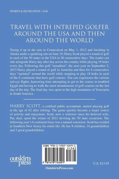 Travel With Intrepid Golfer Around The USA And Then Around The World... Teeing it up in the rain in Connecticut on May 1, 2012 and finishing in Alaska under a sparkling sun on June 19, Harry Scott played a round of golf in each of the 50 states in the USA in 50 consecutive days. The reader can ride alongside Harry day after day across the country while playing 18 holes every day. Following this golf "marathon", the next year on September 2, 2013 Harry played a round of golf in Australia and then for 6 consecutive days "sprinted" around the world while stopping to play 18 holes in each of the 6 continents that have golf courses. You can experience the various red-eye flights, harrowing time attempting to get to the course in troubled Egypt and having to walk the most mountainous of golf courses on the last day of the trip. The final day was spent in the high mountains of Venezuela in South America.