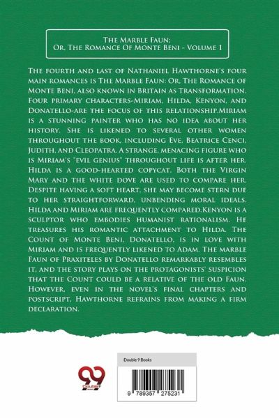 The fourth and last of Nathaniel Hawthorne's four main romances is The Marble Faun: Or, The Romance of Monte Beni, also known in Britain as Transformation. Four primary characters-Miriam, Hilda, Kenyon, and Donatello-are the focus of this relationship.Miriam is a stunning painter who has no idea about her history. She is likened to several other women throughout the book, including Eve, Beatrice Cenci, Judith, and Cleopatra. A strange, menacing figure who is Miriam's "evil genius" throughout life is after her. Hilda is a good-hearted copycat. Both the Virgin Mary and the white dove are used to compare her. Despite having a soft heart, she may become stern due to her straightforward, unbending moral ideals. Hilda and Miriam are frequently compared.Kenyon is a sculptor who embodies humanist rationalism. He treasures his romantic attachment to Hilda. The Count of Monte Beni, Donatello, is in love with Miriam and is frequently likened to Adam. The marble Faun of Praxiteles by Donatello remarkably resembles it, and the story plays on the protagonists' suspicion that the Count could be a relative of the old Faun. However, even in the novel's final chapters and postscript, Hawthorne refrains from making a firm declaration.