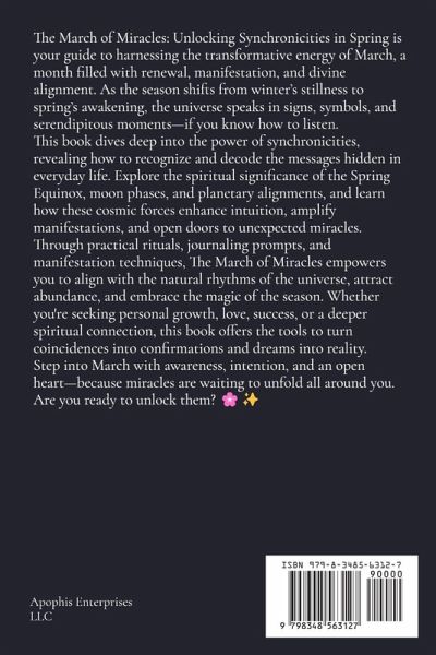 The March of Miracles: Unlocking Synchronicities in Spring is your guide to harnessing the transformative energy of March, a month filled with renewal, manifestation, and divine alignment. As the season shifts from winter's stillness to spring's awakening, the universe speaks in signs, symbols, and serendipitous moments-if you know how to listen. This book dives deep into the power of synchronicities, revealing how to recognize and decode the messages hidden in everyday life. Explore the spiritual significance of the Spring Equinox, moon phases, and planetary alignments, and learn how these cosmic forces enhance intuition, amplify manifestations, and open doors to unexpected miracles. Through practical rituals, journaling prompts, and manifestation techniques, The March of Miracles empowers you to align with the natural rhythms of the universe, attract abundance, and embrace the magic of the season. Whether you're seeking personal growth, love, success, or a deeper spiritual connection, this book offers the tools to turn coincidences into confirmations and dreams into reality. Step into March with awareness, intention, and an open heart-because miracles are waiting to unfold all around you. Are you ready to unlock them? ����✨