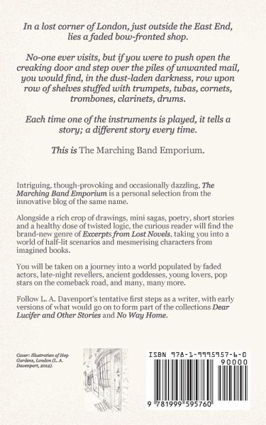 Step into a magical shop on the forgotten streets of London's East End, where musical instruments tell their own stories. In The Marching Band Emporium, L.A. Davenport weaves together an eclectic mix of short stories, poems, and mini-sagas, each filled with vivid imagination and literary charm. From the nostalgic echoes of lost novels to whimsical reflections on life and love, this collection captures moments of beauty, humor, and tragedy. Whether it's the poignant tale of an artist facing death or the fleeting dreams of everyday lives, Davenport's work is a mesmerizing blend of wit and melancholy. Perfect for readers who enjoy the surreal and the profound, this book will take you on a journey through forgotten corners of the mind, where each note and story resonates long after the final page is turned. Explore the haunting, the whimsical, and the heart-wrenching in this personal anthology that invites you to listen to the stories behind the instruments.