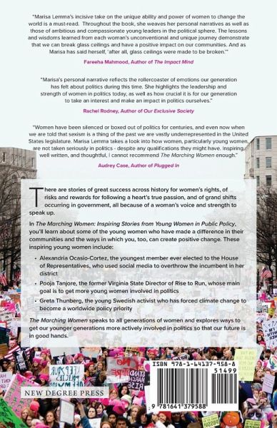 There are stories of great success across history for women's rights, of risks and rewards for following a heart's true passion, and of grand shifts occurring in government, all because of a woman's voice and strength to speak up. In The Marching Women: Inspiring Stories from Young Women in Public Policy, you'll learn about some of the young women who have made a difference in their communities and the ways in which you, too, can create positive change. These inspiring young women include: Alexandria Ocasio-Cortez, the youngest member ever elected to the House of Representatives, who used social media to overthrow the incumbent in her district Pooja Tanjore, the former Virginia State Director of Rise to Run, whose main goal is to get more young women involved in politics Greta Thunberg, the young Swedish activist who has forced climate change to become a worldwide policy priority The Marching Women speaks to all generations of women and explores ways to get our younger generations more actively involved in politics so that our future is in good hands.