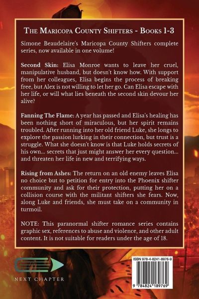 Simone Beaudelaire's Maricopa County Shifters complete series, now available in one volume! Second Skin: Elisa Monroe wants to leave her cruel, manipulative husband, but doesn't know how. With support from her colleagues, Elisa begins the process of breaking free, but Alex is not willing to let her go. Can Elisa escape with her life, or will what lies beneath the second skin devour her alive? Fanning The Flame: A year has passed and Elisa's healing has been nothing short of miraculous, but her spirit remains troubled. After running into her old friend Luke, she longs to explore the passion lurking in their connection, but trust is a struggle. What she doesn't know is that Luke holds secrets of his own... secrets that just might answer her every question... and threaten her life in new and terrifying ways. Rising from Ashes: The return on an old enemy leaves Elisa no choice but to petition for entry into the Phoenix shifter community and ask for their protection, putting her on a collision course with the militant shifters she fears. Now, along Luke and friends, she must take on a community in turmoil. NOTE: This paranormal shifter romance series contains graphic sex, references to abuse and violence, and other adult content. It is not suitable for readers under the age of 18.