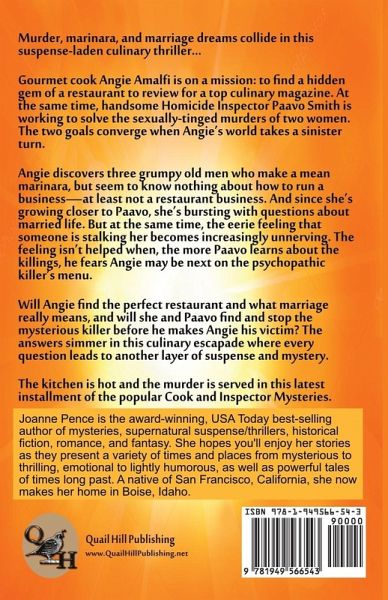 Murder, marinara, and marriage dreams collide in this suspense-laden culinary thriller... Gourmet cook Angie Amalfi is on a mission: to find a hidden gem of a restaurant to review for a top culinary magazine. At the same time, handsome Homicide Inspector Paavo Smith is working to solve the sexually-tinged murders of two women. The two goals converge when Angie's world takes a sinister turn. Angie discovers three grumpy old men who make a mean marinara, but seem to know nothing about how to run a business-at least not a restaurant business. And since she's growing closer to Paavo, she's bursting with questions about married life. But at the same time, the eerie feeling that someone is stalking her becomes increasingly unnerving. The feeling isn't helped when, the more Paavo learns about the killings, he fears Angie may be next on the psychopathic killer's menu. Will Angie find the perfect restaurant and what marriage really means, and will she and Paavo find and stop the mysterious killer before he makes Angie his victim? The answers simmer in this culinary escapade where every question leads to another layer of suspense and mystery. The kitchen is hot and the murder is served in this latest installment of the popular Cook and Inspector Mysteries. NOTE: The main characters in this story appear in an early mystery series by the author. This is a completely reimagined and updated version of Cooking Most Deadly.