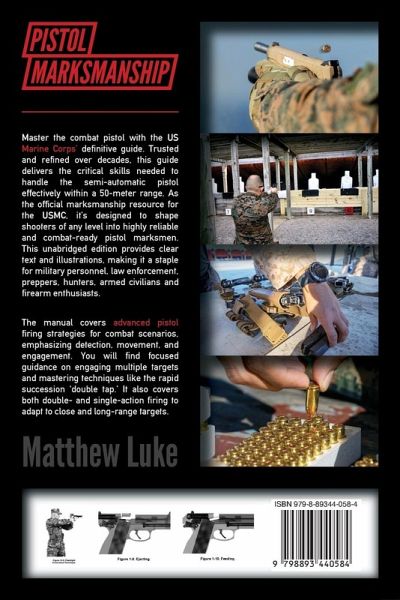 The Marine Pistol Marksmanship Handbook is the US Marine Corps' definitive guide for mastering the combat pistol. Trusted and refined over decades, this guide delivers the critical skills needed to handle the semi-automatic pistol effectively within a 50-meter range.As the official marksmanship resource for the USMC, it's designed to shape shooters of any level into highly reliable and combat-ready pistol marksmen. This unabridged edition provides clear text and illustrations, making it a staple for military personnel, law enforcement, preppers, hunters, armed civilians and firearm enthusiasts.The manual covers advanced pistol firing strategies for combat scenarios, emphasizing target detection, movement response, and precision engagement. You will find focused guidance on engaging multiple targets and mastering techniques like the rapid succession 'double tap.' It also covers both double- and single-action firing to adapt to close and long-range targets effectively.Learn: * Target Detection: Techniques for identifying enemy indicators like movement, sound, and improper camouflage. * Two-Shot Technique: Maximizes impact on close-range targets with rapid, precise fire. * Single and Double Action Modes: Switch seamlessly between modes to balance speed and accuracy. * Combat Mindset: Techniques for building situational awareness under intense conditions. Whether for self-defense, survival, or professional development, this manual equips you with the advanced skills to manage any high-stakes situation. Gain the precision, speed, and combat mindset you need to confidently engage threats in any environment.Originally written by the USMC, this specific product has been reformatted for easier publication. It has not been edited in any way for widespread, unrestricted, unendorsed distribution.