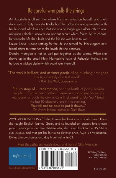 Ari Apostollis is all set. Her whole life she's relied on herself, and she's done well: at forty-two she finally had the baby she always wanted with her husband who loves her. But she can no longer go it alone after a rare antiquities dealer uncovers an ancient secret which forces Ari to choose between the life she's built and the life she was born to live. Laurie Locke is done settling for the life she settled for. Her elegant new friend offers to treat her to the lavish life she deserves. Deirdre Morrigan is not as well put together as she seems. When she shows up in the small New Hampshire town of Ashuelot Hollow, she harbors a wicked desire which could ruin them all.