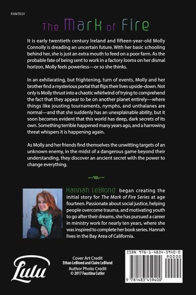 It is early twentieth century Ireland and fifteen-year-old Molly Connolly is dreading an uncertain future. With her basic schooling behind her, she is just an extra mouth to feed on a poor farm. As the probable fate of being sent to work in a factory looms on her dismal horizon, Molly feels powerless-or so she thinks. In an exhilarating turn of events, Molly and her brother find a mysterious portal that flips their lives upside-down. Not only is Molly thrust into a chaotic whirlwind of trying to comprehend the fact that they appear to be on another planet entirely and that she suddenly has an unexplainable ability, but it soon becomes evident that this world has deep, dark secrets of its own. Something terrible happened many years ago, and a harrowing threat whispers it is happening again. As Molly and her friends find themselves the unwitting targets of an unknown enemy, in the midstof a dangerous game beyond their understanding, they discover an ancient secret with the power to change everything.