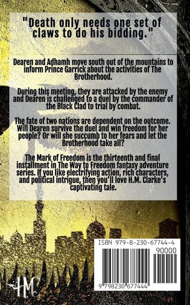 Death only needs one set of claws to do his bidding. Dearen and Adhamh move south out of the mountains to inform Prince Garrick about the activities of The Brotherhood. During this meeting, they are attacked by the enemy and Dearen is challenged to a duel by the commander of the Black Clad to trial by combat. The fate of two nations are dependent on the outcome. Will Dearen survive the duel and win freedom for her people? Or will she succumb to her fears and let the Brotherhood take all? Embark on a journey filled with magical combat, bold heroes, and non-stop action in The Mark of Freedom, the 13th book in The Way to Freedom series. H.M. Clarke weaves an unforgettable tale that will keep you on the edge of your seat. Get your copy now and join the adventure!