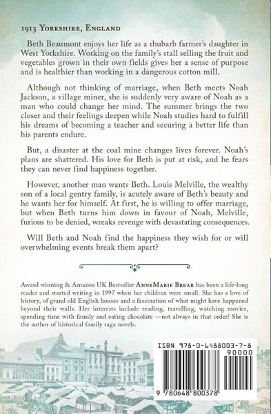 1913 Yorkshire, England Beth Beaumont enjoys her life as a rhubarb farmer's daughter in West Yorkshire. Working on the family's stall selling the fruit and vegetables grown in their own fields gives her a sense of purpose and is healthier than working in a dangerous cotton mill. Although not thinking of marriage, when Beth meets Noah Jackson, a village miner, she is suddenly very aware of Noah as a man who could change her mind. The summer brings the two closer and their feelings deepen while Noah studies hard to fulfill his dreams of becoming a teacher and securing a better life than his parents endure. But, a disaster at the coal mine changes lives forever. Noah's plans are shattered. His love for Beth is put at risk, and he fears they can never find happiness together. However, another man wants Beth. Louis Melville, the wealthy son of a local gentry family, is acutely aware of Beth's beauty and he wants her for himself. At first, he is willing to offer marriage, but when Beth turns him down in favour of Noah, Melville, furious to be denied, reeks revenge with devastating consequences. Will Beth and Noah find the happiness they wish for or will overwhelming events break them apart?