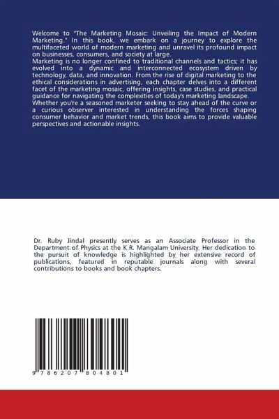 Welcome to "The Marketing Mosaic: Unveiling the Impact of Modern Marketing." In this book, we embark on a journey to explore the multifaceted world of modern marketing and unravel its profound impact on businesses, consumers, and society at large.Marketing is no longer confined to traditional channels and tactics; it has evolved into a dynamic and interconnected ecosystem driven by technology, data, and innovation. From the rise of digital marketing to the ethical considerations in advertising, each chapter delves into a different facet of the marketing mosaic, offering insights, case studies, and practical guidance for navigating the complexities of today's marketing landscape.Whether you're a seasoned marketer seeking to stay ahead of the curve or a curious observer interested in understanding the forces shaping consumer behavior and market trends, this book aims to provide valuable perspectives and actionable insights.