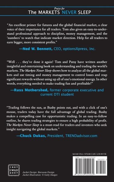 "Well . . . they've done it again! Tom and Patsy have written another insightful and entertaining book on understanding and trading the world's markets. The Markets Never Sleep shows how to analyze all the global markets and use timing and money management to control losses and reap significant rewards without using up all of one's emotional energy. In other words, everything needed to make trading fun and profitable!"