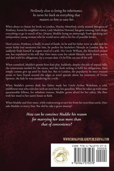 Perilously close to losing his inheritance, he turns his back on everything that matters to him to save her. When about to choose his bride in London, Hartley Montford, newly minted Marquess of Pembury, learns his neighbor's niece, Lady Madeline Howard, has gone missing, Hart drops everything to go in search of her. Despite Maddie being an annoyingly frank-speaking and independent young woman who he would never add to his list of possible brides. Hart's estate, Pembury, is badly in need of funds. As he and his father were at odds and the estate holds bad memories for him, he prefers his bachelor's lifestyle in London. But he suddenly finds himself in urgent need of a wife. His Uncle William, the Montford second son, has stipulated in his will that Hart must cease his rakish lifestyle, settle down, marry and deal with his obligations, by a certain date. Or he'll be cut out of the will. When consulted, Maddie's groom fears foul play. Suddenly, despite the pile of unpaid bills, the renovations needed for the estate, and the clock ticking to fulfil his obligations, Hart simply cannot give up until he finds her. But in London, the popularity he once enjoyed seems to have frayed around the edges as word spreads about his treatment of Vivian Spencer, the lady he was considering for a wife. When Maddie's parents died, her father made her Uncle Arthur Wakeham, a cold, indifferent man who rules her with an iron hand, her guardian. When he takes up with some questionable fellows, for nebulous reasons, Maddie grows afraid for her safety. She flees with her maid to her aunt's house in Bath. When Maddie and Hart meet, while endeavoring to save her from her scurrilous uncle, Hart asks Maddie to marry him. But did he take a grave misstep? How can he convince Maddie his reason for marrying her was more than that of convenience? Improper Lords Book 1 - The Duke's Masquerade Book 2 - The Marquess Takes a Misstep Book 3 - The Earl's Brazen Bargain