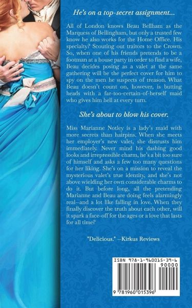 When a marquess goes undercover as a valet to catch a traitor, a sassy lady's maid gets suspicious. He's on a top-secret assignment. All of London knows Beau Bellham as the Marquess of Bellingham, but only a trusted few know he also works for the Home Office. His specialty? Scouting out traitors to the Crown. So, when one of his friends pretends to be a footman at a house party in order to find a wife, Beau decides posing as a valet at the same gathering will be the perfect cover for him to spy on the men he suspects of treason. What Beau doesn't count on, however, is butting heads with a far-too-certain-of-herself maid who gives him hell at every turn. She's about to blow his cover. Miss Marianne Notley is a lady's maid with more secrets than hairpins. When she meets her employer's new valet, she distrusts him immediately. Never mind his dashing good looks and irrepressible charm, he's a bit too sure of himself and asks a few too many questions for her liking. She's on a mission to reveal the mysterious valet's true identity, and she's not above wielding her own considerable charms to do it. But before long, all the pretending Marianne and Beau are doing feels alarmingly real-and a lot like falling in love. When they finally discover the truth about each other, will it spark a face-off for the ages or a love that lasts for all time?