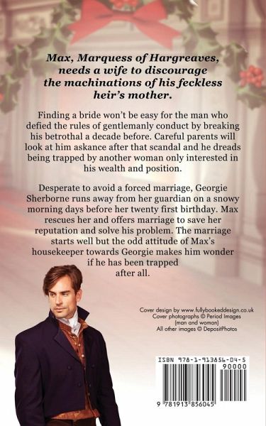 Max, Marquess of Hargreaves, is in urgent need of a wife. Searching for a bride is a daunting prospect with seven sisters all eager to help. Finding the sort of bride he is likely to be happy with won't be easy for the man who defied the rules of gentlemanly conduct by breaking his betrothal a decade before. Careful parents will look at him askance after that scandal and he dreads being trapped by another woman only interested in his wealth and position. Desperate to escape a forced marriage, Georgie Sherborne runs away from her guardian on a snowy morning days before her twenty first birthday. Max rescues her and offers marriage to save her reputation and solve his problem. The marriage starts well but the odd attitude of Max's housekeeper towards Georgie makes him wonder if he has been trapped after all. Stolen kisses, a Christmas Eve wedding and the joy of a traditional family Christmas all feature in this heartwarming Regency romance. Perfect for readers of Mary Balogh, Stephanie Laurens, Julia Quinn, Georgette Heyer and Jane Austen.