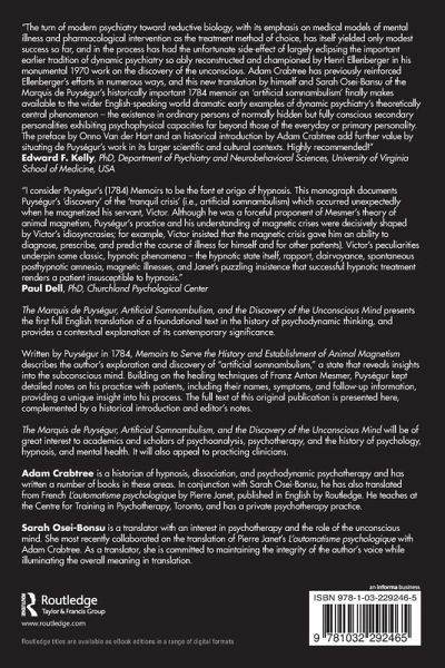 Adam Crabtree is a historian of hypnosis, dissociation, and psychodynamic psychotherapy and has written a number of books in these areas. In conjunction with Sarah Osei-Bonsu, he has also translated from French L'automatisme psychologique by Pierre Janet, published in English by Routledge. He teaches at the Centre for Training in Psychotherapy, Toronto, and has a private psychotherapy practice. Sarah Osei-Bonsu is a translator with an interest in psychotherapy and the role of the unconscious mind. She most recently collaborated on the translation of Pierre Janet's L'automatisme psychologique with Adam Crabtree. As a translator, she is committed to maintaining the integrity of the author's voice while illuminating the overall meaning in translation.