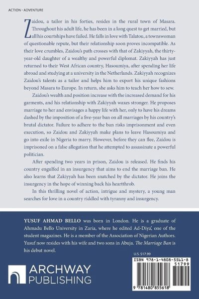 Zaidou, a tailor in his forties, resides in the rural town of Masara. Throughout his adult life, he has been in a long quest to get married, but all his courtships have failed. He falls in love with Talatou, a townswoman of questionable repute, but their relationship soon proves incompatible. As their love crumbles, Zaidou's path crosses with that of Zakiyyah, the thirty-year-old daughter of a wealthy and powerful diplomat. Zakiyyah has just returned to their West African country, Hasoumiya, after spending her life abroad and studying at a university in the Netherlands. Zakiyyah recognizes Zaidou's talents as a tailor and helps him to export his unique fashions beyond Masara to Europe. In return, she asks him to teach her how to sew. Zaidou's wealth and position increase with the increased demand for his garments, and his relationship with Zakiyyah waxes stronger. He proposes marriage to her and envisages a happy life with her, only to have his dreams dashed by the imposition of a five-year ban on all marriages by his country's brutal dictator. Failure to adhere to the ban risks imprisonment and even execution, so Zaidou and Zakiyyah make plans to leave Hasoumiya and go into exile in Nigeria to marry. However, before they can flee, Zaidou is imprisoned on a false allegation that he attempted to assassinate a powerful politician. After spending two years in prison, Zaidou is released. He finds his country engulfed in an insurgency that aims to end the marriage ban. He also learns that Zakiyyah has been snatched by the dictator. He joins the insurgency in the hope of winning back his heartthrob. In this thrilling novel of action, intrigue and mystery, a young man searches for love in a country riddled with tyranny and insurgency.