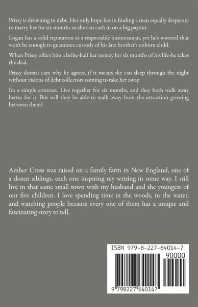 Prissy is drowning in debt. Her only hope lies in finding an equally desperate man willing to marry her for six months so she can cash in on a big payout. Logan has a solid reputation as a respectable businessman, yet he's worried that won't be enough to guarantee custody of his late brother's unborn child. When Prissy offers him a bribe-half her money for six months of his life-he takes the deal to strengthen his case with the courts. Prissy doesn't care why he agrees, if it means she can sleep at night without visions of debt collectors coming to take her away. It's a simple deal. Live together for six months, and they both walk away better for it. But will they be able to walk away from the attraction growing between them?