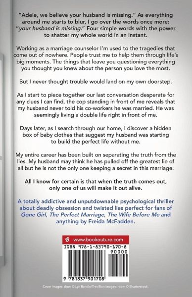 "Adele, we believe your husband is missing." As everything around me starts to blur, I go over the words once more: "your husband is missing." Four simple words with the power to shatter my whole world in an instant. Working as a marriage counselor I'm used to the tragedies that come out of nowhere. People trust me to help them through life's big moments. The things that leave you questioning everything you thought you knew about the person you love the most. But I never thought trouble would land on my own doorstep. As I start to piece together our last conversation desperate for any clues I can find, the cop standing in front of me reveals that my husband never told his co-workers he was married. He was seemingly living a double life right in front of me. Days later, as I search through our home, I discover a hidden box of baby clothes that suggest my husband was starting to build the perfect life without me. My entire career has been built on separating the truth from the lies. My husband may think he has pulled off the greatest lie of all but he is not the only one keeping a secret in this marriage. All I know for certain is that when the truth comes out, only one of us will make it out alive. A totally addictive and unputdownable psychological thriller about deadly obsession and twisted lies perfect for fans of Gone Girl, The Perfect Marriage, The Wife Before Me and anything by Freida McFadden. What readers are saying about Dea Poirier: "OMG the ending... I'm literally on the edge of my seat... Gives you goosebumps." Spookysmazeofbooks ¿¿¿¿¿ "Woah what a story!... Gripping... Jaw-dropping... Terrific." rubie_reads ¿¿¿¿¿ "Gripping... Earth-shattering... I am hooked... I highly recommend this... Outstanding... Amazing!" Jonannlovesbooktalk ¿¿¿¿¿ "An edge of your seat mystery... Kept me up half the night. Very gripping and suspenseful." Goodreads reviewer ¿¿¿¿¿ "Perfectly paced, slowly revealing secret after secret until you're not sure of anything anymore, only that you have to keep reading... Gripping... Who needs sleep?... A thrilling, edge of my seat novel." Goodreads reviewer "Queen of the cliffhanger!! Dea keeps you gripped... Has you on the edge of your seat!!" Goodreads reviewer