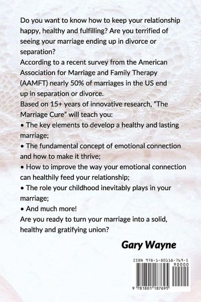 Do you want to know how to keep your relationship happy, healthy and fulfilling and make sure it attains its highest potential? Are you terrified of seeing your marriage ending up in divorce or separation? Then keep reading! According to a recent survey from the American Association for Marriage and Family Therapy (AAMFT) nearly 50% of marriages in the US end up in separation or divorce. This means that actually, in the same time, there are more divorces than couple says their wedding vows. How can you make sure your marriage is not one of these? Is there a way you can prevent your "holy union" from ending in a thousand pieces? Well, what you should be doing is to focus on the original meaning of the marriage as a once in a lifetime union between two different persons, without modeling your idea on what celebrities, or friends do. Based on 15+ years of innovative research, "The Marriage Cure" will teach you: · The key elements to develop a healthy and lasting marriage; · The fundamental concept of emotional connection and how to make it thrive; · How to improve the way your emotional connection can healthily feed your relationship; · The role your childhood inevitably plays in your marriage; · And much more! Are you ready to turn your marriage into a solid, healthy and gratifying union? FAQs Is this books supposed only for married couples who are facing some troubles? This book is indicated for all couples who want to strengthen their relationship and tools for improving their emotional connection, no matter whether they are engaged or married. What is the best way to use this book as a guide? I would recommend you to read this book first alone, and then together with your partner. You can then share with him/her each question you might have, and finally keep a personal note of the changes you both want to make in your relationship.