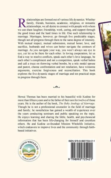 Synopsis: Relationships are formed out of various life dynamics. Whether family, friends, business, academic, religious, or romantic relationships, we all desire to connect with people with whom we can share laughter, friendship, work, caring, and support through the good times and the hard times in life. One such relationship is marriage. Marriages, however, go through five predictable stages, though not all progress through them to the same degree of intensity. With mutual respect, mutual submission, mutual honor, love, and sacrifice, husbands and wives can better navigate the contours of marriage. As you navigate your way, you won't always see eye to eye, yet let us be there for each other. In loving cooperation, let us find a way to resolve conflicts, speak each other's love language, be each other's compliment and not a competition, speak verbal balms and call a truce on throwing verbal bombs, be a role model spouse and parent, choose confrontation and not retaliation, have winsome arguments, exercise forgiveness and reconciliation. This book explores the five dynamic stages of marriage and ten practical steps to progress through them. Autobiography: Howai Thomas has been married to his beautiful wife Kedine for more than fifteen years and is the father of their son for twelve of those years. He is the author of the book, The Baby Analogy of Marriage. Though he is not a professional counselor in the field of marriage and family; he nonetheless has gained a wealth of experience over the years conducting seminars and public speaking on the topic. He enjoys learning and sharing the bible, health, and psychosocial information that has been life-changing for himself and countless others. He and Kedine co-founded Mission Wholelife Initiative, which endeavors to improve lives and the community through faith-based initiatives.