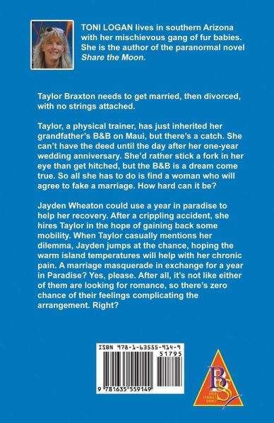 Taylor Braxton needs to get married, then divorced, with no strings attached. Taylor, a physical trainer, has just inherited her grandfather's B&B on Maui, but there's a catch. She can't have the deed until the day after her one-year wedding anniversary. She'd rather stick a fork in her eye than get hitched, but the B&B is a dream come true. So, all she has to do is find a woman who will agree to fake a marriage. How hard can it be? Jayden Wheaton could use a year in paradise to help her recovery. After a crippling accident she hires Taylor in the hope of gaining back some mobility. When Taylor casually mentions her dilemma, Jayden jumps at the chance, hoping the warm island temperatures will help with her chronic pain. A marriage masquerade in exchange for a year in Paradise? Yes, please. After all, it's not like either of them are looking for romance, so there's zero chance of their feelings complicating the arrangement. Right?