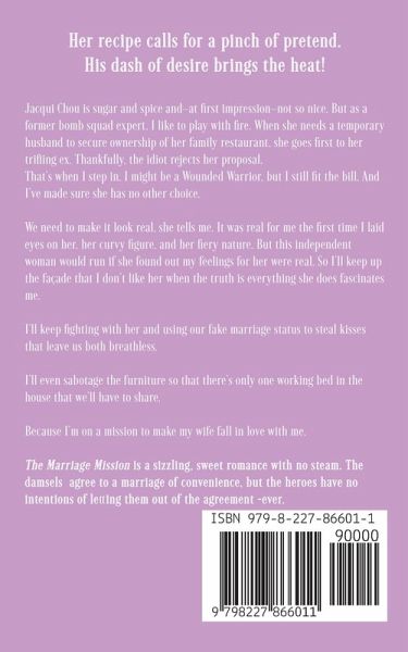 Her recipe calls for a pinch of pretend. His dash of desire brings the heat! Jacqui Chou is sugar and spice and-at first impression-not so nice. But as a former bomb squad expert, I like to play with fire. When she needs a temporary husband to secure ownership of her family restaurant, she goes first to her trifling ex. Thankfully, the idiot rejects her proposal. That's when I step in. I might be a Wounded Warrior, but I still fit the bill. And I've made sure she has no other choice. We need to make it look real, she tells me. It was real for me the first time I laid eyes on her, her curvy figure, and her fiery nature. But this independent woman would run if she found out my feelings for her were real. So I'll keep up the façade that I don't like her when the truth is everything she does fascinates me. I'll keep fighting with her and using our fake marriage status to steal kisses that leave us both breathless. I'll even sabotage the furniture so that there's only one working bed in the house that we'll have to share. Because I'm on a mission to make my wife fall in love with me. The Marriage Mission is a sizzling, sweet romance with no steam. The damsels agree to a marriage of convenience, but the heroes have no intentions of letting them out of the agreement-ever.