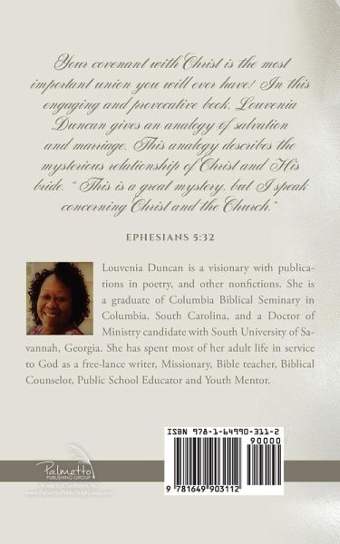 Your covenant with Christ is the most important union you will ever have! In this engaging and provocative book, Louvenia Duncan gives an analogy of salvation and marriage. This analogy describes the mysterious relationship of Christ and His bride. "This is a great mystery, but I speak concerning Christ and the Church." - EPHESIANS 5:32
