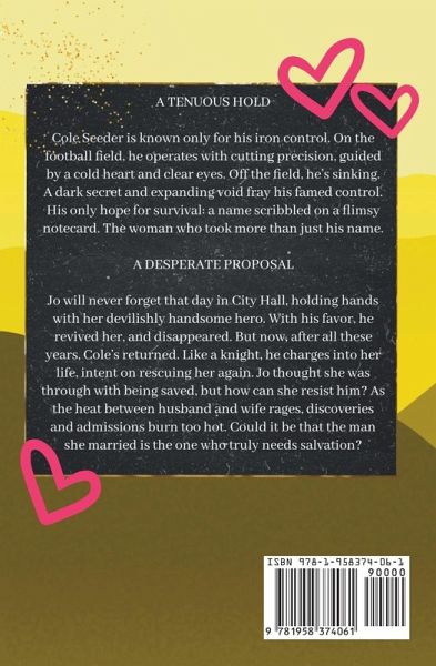 A TENUOUS HOLD Cole Seeder is known only for his iron control. On the football field, he operates with cutting precision, guided by a cold heart and clear eyes. Off the field, he's sinking. A dark secret and expanding void fray his famed control. His only hope for survival: a name scribbled on a flimsy notecard. The woman who took more than just his name. A DESPERATE PROPOSAL Jo will never forget that day in City Hall, holding hands with her devilishly handsome hero. With his favor, he revived her, and disappeared. But now, after all these years, Cole's returned. Like a knight, he charges into her life, intent on rescuing her again. Jo thought she was through with being saved, but how can she resist him? As the heat between husband and wife rages, discoveries and admissions burn too hot. Could it be that the man she married is the one who truly needs salvation?