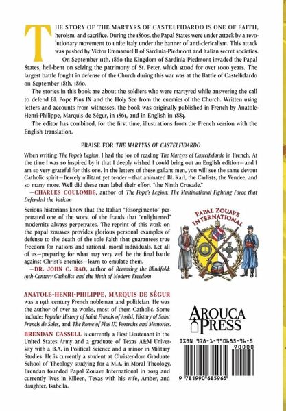 The story of the Martyrs of Castelfidardo is one of faith, heroism, and sacrifice. During the 1860s, the Papal States were under attack by a revolutionary movement to unite Italy under the banner of anti-clericalism. This attack was pushed by Victor Emmanuel II of Sardinia-Piedmont and Italian secret societies. On September 11th, 1860 the Kingdom of Sardinia-Piedmont invaded the Papal States, hellbent on seizing the patrimony of St. Peter, which stood for over 1000 years. The largest battle fought in defense of the Church during this war was at the Battle of Castelfidardo on September 18th, 1860. The compilation of stores in this book are about the soldiers who were martyred while answering the call to defend Bl. Pope Pius IX and the Holy See from the enemies of the Church. Written using letters and accounts from witnesses, the book was originally published in French by Anatole-Henri-Philippe, Marquis de Ségur in 1861, and in English in 1883. The editor has combined, for the first time, illustrations from the French version with the English translation.