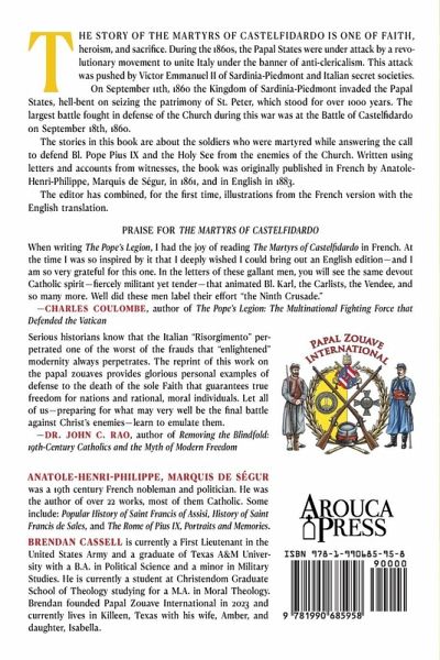 The story of the Martyrs of Castelfidardo is one of faith, heroism, and sacrifice. During the 1860s, the Papal States were under attack by a revolutionary movement to unite Italy under the banner of anti-clericalism. This attack was pushed by Victor Emmanuel II of Sardinia-Piedmont and Italian secret societies. On September 11th, 1860 the Kingdom of Sardinia-Piedmont invaded the Papal States, hellbent on seizing the patrimony of St. Peter, which stood for over 1000 years. The largest battle fought in defense of the Church during this war was at the Battle of Castelfidardo on September 18th, 1860. The compilation of stores in this book are about the soldiers who were martyred while answering the call to defend Bl. Pope Pius IX and the Holy See from the enemies of the Church. Written using letters and accounts from witnesses, the book was originally published in French by Anatole-Henri-Philippe, Marquis de Ségur in 1861, and in English in 1883. The editor has combined, for the first time, illustrations from the French version with the English translation.