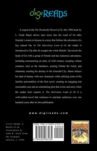 A sequel to the "The Wonderful Wizard of Oz", this 1904 book by L. Frank Baum delves once more into the Land of Oz after Dorothy's return to Kansas in a story that follows the adventure of a boy named Tip. In "The Marvelous Land of Oz" the reader is introduced to Tip after he escapes the witch Mombi. Tip travels the lands of Oz with a group of friends and has numerous adventures, including encountering an army of wild women, escaping violent creatures such as the Jackdaws, seeking Glinda the Good, and ultimately meeting his destiny in the Emerald City. Baum infuses his land of fantasy with new characters while utilizing some of the familiar personalities of the first novel, creating an engaging and memorable cast and an entertaining plot that twists and turns when the reader least expects it. "The Marvelous Land of Oz" is a well-crafted novel that continues to entertain audiences over one hundred years after its first publication. This edition is printed on premium acid-free paper.