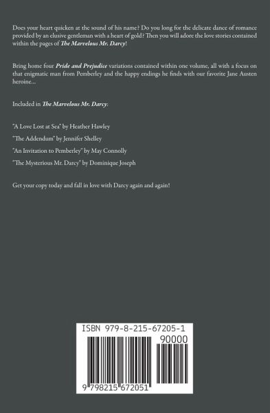 Does your heart quicken at the sound of his name? Do you long for the delicate dance of romance provided by an elusive gentleman with a heart of gold? Then you will adore the love stories contained within the pages of The Marvelous Mr. Darcy! Bring home four Pride and Prejudice variations contained within one volume, all with a focus on that enigmatic man from Pemberley and the happy endings he finds with our favorite Jane Austen heroine… Included in The Marvelous Mr. Darcy: "A Love Lost at Sea" by Heather Hawley "The Addendum" by Jennifer Shelley "An Invitation to Pemberley" by May Connolly "The Mysterious Mr. Darcy" by Dominique Joseph Get your copy today and fall in love with Darcy again and again!