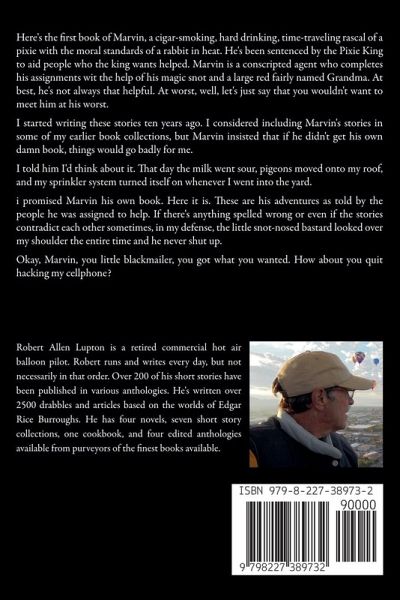 Here's the first book of Marvin, a cigar-smoking, hard drinking, time-traveling rascal of a pixie with the moral standards of a rabbit in heat. He's been sentenced by the Pixie King to aid people who the king wants helped. Marvin is a conscripted agent who completes his assignments wit the help of his magic snot and a large red fairly named Grandma. At best, he's not always that helpful. At worst, well, let's just say that you wouldn't want to meet him at his worst. I started writing these stories ten years ago. I considered including Marvin's stories in some of my earlier book collections, but Marvin insisted that if he didn't get his own damn book, things would go badly for me. I told him I'd think about it. That day the milk went sour, pigeons moved onto my roof, and my sprinkler system turned itself on whenever I went into the yard. i promised Marvin his own book. Here it is. These are his adventures as told by the people he was assigned to help. If there's anything spelled wrong or even if the stories contradict each other sometimes, in my defense, the little snot-nosed bastard looked over my shoulder the entire time and he never shut up. Okay, Marvin, you little blackmailer, you got what you wanted. How about you quit hacking my cellphone?