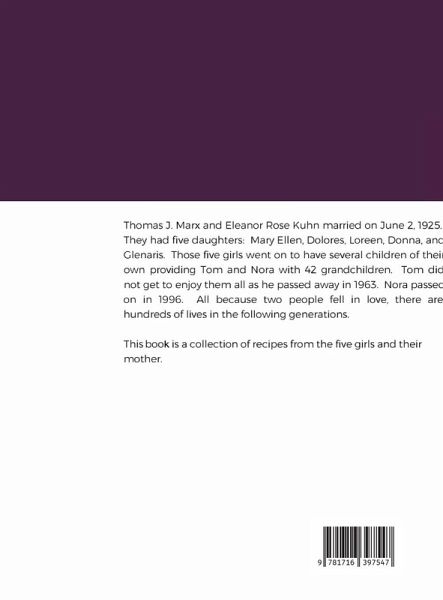 This book is a collection of recipes from the Marx Family in North Dakota. It was written as a gift to the family on behalf of Donna Bolan.