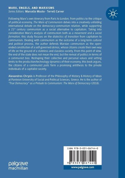Following Marx's own itinerary from Paris to London, from politics to the critique of political economy, The Marx of Communism delves into a creatively unfolding international debate on the democracy-communism relation, while supporting a 21st century communism as a social alternative to capitalism. Taking into consideration Marx's analysis of communism both as a movement and a social formation, this study focuses on the dialectics of transition from capitalism to communism. Dealing with communism as the outcome of a long-term cultural and political process, the author defends Marxian communism as the open-ended constitution of a self-governed demos, whose citizens create their own way of life on the ground of a stateless and classless society. From this point of view, the end of the state does not mean the end, but the revival of politics in terms of a communist bios. Reshaping their collective and personal values and setting limits to the production/technology dynamics of their economy, this book argues, the citizens of a communist polis form a promising antithesis to the private individuals of a capitalist society.