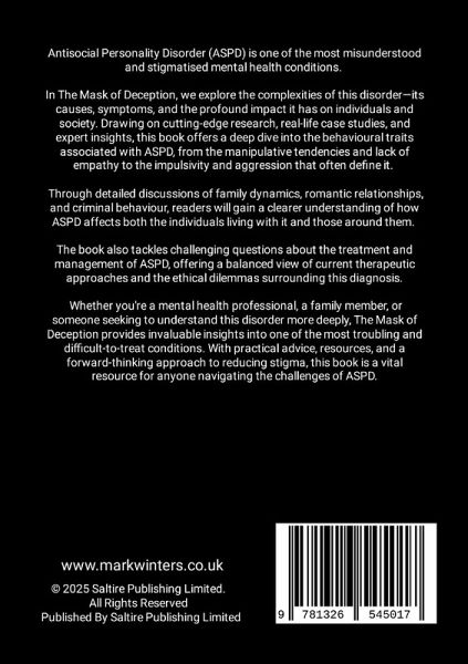 Antisocial Personality Disorder (ASPD) is one of the most misunderstood and stigmatised mental health conditions. In The Mask of Deception, we explore the complexities of this disorder-its causes, symptoms, and the profound impact it has on individuals and society. Drawing on cutting-edge research, real-life case studies, and expert insights, this book offers a deep dive into the behavioural traits associated with ASPD, from the manipulative tendencies and lack of empathy to the impulsivity and aggression that often define it. Through detailed discussions of family dynamics, romantic relationships, and criminal behaviour, readers will gain a clearer understanding of how ASPD affects both the individuals living with it and those around them. The book also tackles challenging questions about the treatment and management of ASPD, offering a balanced view of current therapeutic approaches and the ethical dilemmas surrounding this diagnosis. Whether you're a mental health professional, a family member, or someone seeking to understand this disorder more deeply, The Mask of Deception provides invaluable insights into one of the most troubling and difficult-to-treat conditions. With practical advice, resources, and a forward-thinking approach to reducing stigma, this book is a vital resource for anyone navigating the challenges of ASPD.
