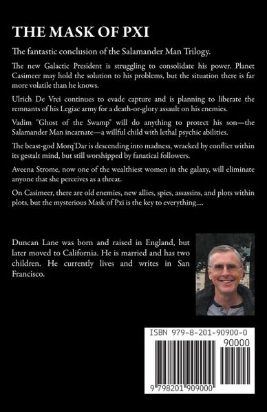 The Mask of Pxi The fantastic conclusion of the Salamander Man Trilogy. The new Galactic President is struggling to consolidate his power. Planet Casimeer may hold the solution to his problems, but the situation there is far more volatile than he knows. Ulrich De Vrei continues to evade capture and is planning to liberate the remnants of his Legiac army for a death-or-glory assault on his enemies. Vadim "Ghost of the Swamp" will do anything to protect his son—the Salamander Man incarnate—a willful child with lethal psychic abilities. The beast-god Morq'Dar is descending into madness, wracked by conflict within its gestalt mind, but still worshipped by fanatical followers. Aveena Strome, now one of the wealthiest women in the galaxy, will eliminate anyone that she perceives as a threat. On Casimeer, there are old enemies, new allies, spies, assassins, and plots within plots, but the mysterious Mask of Pxi is the key to everything….