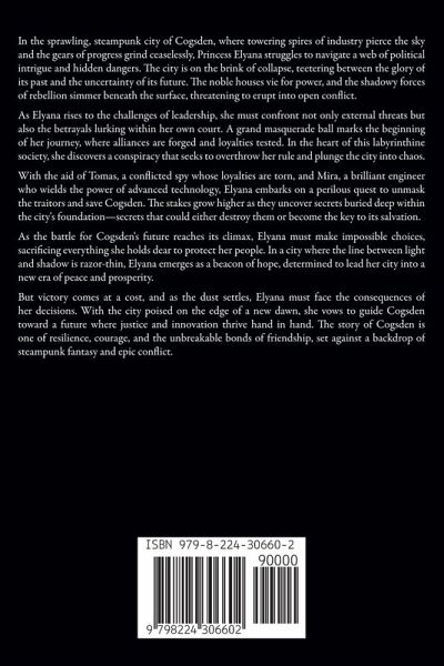 In the sprawling, steampunk city of Cogsden, where towering spires of industry pierce the sky and the gears of progress grind ceaselessly, Princess Elyana struggles to navigate a web of political intrigue and hidden dangers. The city is on the brink of collapse, teetering between the glory of its past and the uncertainty of its future. The noble houses vie for power, and the shadowy forces of rebellion simmer beneath the surface, threatening to erupt into open conflict. As Elyana rises to the challenges of leadership, she must confront not only external threats but also the betrayals lurking within her own court. A grand masquerade ball marks the beginning of her journey, where alliances are forged and loyalties tested. In the heart of this labyrinthine society, she discovers a conspiracy that seeks to overthrow her rule and plunge the city into chaos. With the aid of Tomas, a conflicted spy whose loyalties are torn, and Mira, a brilliant engineer who wields the power of advanced technology, Elyana embarks on a perilous quest to unmask the traitors and save Cogsden. The stakes grow higher as they uncover secrets buried deep within the city's foundation-secrets that could either destroy them or become the key to its salvation. As the battle for Cogsden's future reaches its climax, Elyana must make impossible choices, sacrificing everything she holds dear to protect her people. In a city where the line between light and shadow is razor-thin, Elyana emerges as a beacon of hope, determined to lead her city into a new era of peace and prosperity. But victory comes at a cost, and as the dust settles, Elyana must face the consequences of her decisions. With the city poised on the edge of a new dawn, she vows to guide Cogsden toward a future where justice and innovation thrive hand in hand. The story of Cogsden is one of resilience, courage, and the unbreakable bonds of friendship, set against a backdrop of steampunk fantasy and epic conflict.