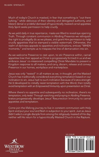 Much of today's Church is masked, in fear that something is "out there lurking," while oblivious of their identity and delegated authority, and blatant denial or prideful dismissal of hypocritically masked carnal appetites Holy Spirit seeks permission to help crucify. As we yield daily in true repentance, masks are lifted to reveal eye-opening Truth. Through constant communion in Abiding Presence we relinquish the right to prodigally do as we please, and grant Him permission to help crucify appetites that've stamped a visible watermark. Otherwise, the realm of darkness appeals to appetites and inclinations, entices "WHEN moments," and tempts us to trespass the line of demarcation into sin. As we welcome Presence to rest upon, to stir Presence within, carnal appetites lose their appeal as Christ is progressively formed in us and we embrace Jesus' co-missioned compelling Christ Mandate to present a Kingdom response to all matters, and carry, discern, release and convey Presence in our homes, workplace and marketplace. Jesus was only "tested" in all matters as we, in thought, yet the Masked Church has traditionally considered everything temptation based on our inclination to sin. Jesus had no such inclination because of kratos strength He'd developed to initially resist temptation with the Word, then totally avoid temptation with an Empowered Immunity upon presentation as Christ. Where there's no appetite and subsequently no inclination, there's no temptation, only tests! Through watching and praying in Abiding Presence, kratos progressively develops Jesus' Resurrection Immunity to carnal appetites and temptation. Come join the lifelong journey to live in constant communion with Holy Spirit and put your soul and flesh in subjection to your spirit. Just as Jesus didn't select a single disciple from among the religiously masked of His day, neither will He return for a hypocritically Masked Church in the Rapture.
