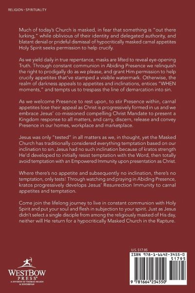 Much of today's Church is masked, in fear that something is "out there lurking," while oblivious of their identity and delegated authority, and blatant denial or prideful dismissal of hypocritically masked carnal appetites Holy Spirit seeks permission to help crucify. As we yield daily in true repentance, masks are lifted to reveal eye-opening Truth. Through constant communion in Abiding Presence we relinquish the right to prodigally do as we please, and grant Him permission to help crucify appetites that've stamped a visible watermark. Otherwise, the realm of darkness appeals to appetites and inclinations, entices "WHEN moments," and tempts us to trespass the line of demarcation into sin. As we welcome Presence to rest upon, to stir Presence within, carnal appetites lose their appeal as Christ is progressively formed in us and we embrace Jesus' co-missioned compelling Christ Mandate to present a Kingdom response to all matters, and carry, discern, release and convey Presence in our homes, workplace and marketplace. Jesus was only "tested" in all matters as we, in thought, yet the Masked Church has traditionally considered everything temptation based on our inclination to sin. Jesus had no such inclination because of kratos strength He'd developed to initially resist temptation with the Word, then totally avoid temptation with an Empowered Immunity upon presentation as Christ. Where there's no appetite and subsequently no inclination, there's no temptation, only tests! Through watching and praying in Abiding Presence, kratos progressively develops Jesus' Resurrection Immunity to carnal appetites and temptation. Come join the lifelong journey to live in constant communion with Holy Spirit and put your soul and flesh in subjection to your spirit. Just as Jesus didn't select a single disciple from among the religiously masked of His day, neither will He return for a hypocritically Masked Church in the Rapture.