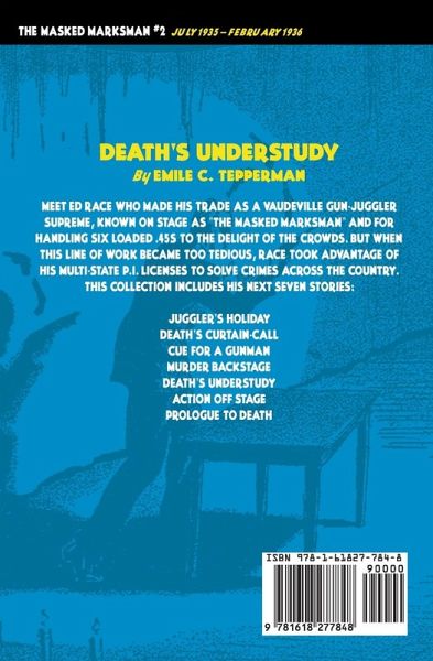 Meet Ed Race who made his trade as a vaudeville gun-juggler supreme, known on stage as "The Masked Marksman" and for handling six loaded .45s to the delight of the crowds. But when this line of work became too tedious, Race took advantage of his multi-state P.I. licenses to solve crimes across the country. This collection includes his next seven stories:Juggler's Holiday: Ed Race, gun-juggler supreme, liked to help his friends out of tight places. But when that gun-active Samaritanism led him between the raking crossfires of both gangsters and police, Ed knew there was only one thing to do: blast his way out in a double gamble with death! Death's Curtain-Call: Ed Race, who juggled guns for both business and pleasure, wanted to do a favor for a pretty girl friend... But a crooked poker game and a murder plot nearly made Death step forward to take Ed's final bow...! Cue for a Gunman: Ed Race, six-gun magician, realized that a fast horse, a crooked bookie, and a quarter million dollars-mixed together-meant big-time trouble... But Slingel's mob didn't know Ed could juggle hot dough just as well as hot revolvers...! Murder Backstage: Ed Race didn't like bandits-even the nervous and beautiful girl targeting him with an automatic... But when he understood the set-up, he barged head first into a six-gun ambush to help her out! Death's Understudy: Ed Race couldn't say, "No!" when a friend bid for his aid-even when it meant chancing a suit of hot tar and feathers... and a grim threat of more, and deadlier, hell to come! Action Off Stage: Ed Race wasn't looking for a fight, but a pretty girl's lie and a crooked sheriff's stubbornness shoved it right into his lap. And good-natured as he was, Ed figured it was time to quit joking when the hillbillies rallied for a necktie party! Prologue to Death: It gave Ed Race a queasy feeling when his Broadway pals treated him like a leper... And it took a bloody tommy-gun lesson to teach him that one determined enemy, hidden in a host of friends, can put a man on a cold morgue slab.