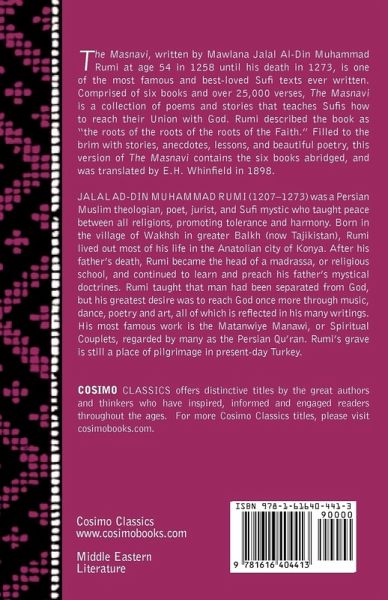 The Masnavi, written by Mawlana Jalal Al-Din Muhammad Rumi at age 54 in 1258 until his death in 1273, is one of the most famous and best-loved Sufi texts ever written. Comprised of six books and over 25,000 verses, The Masnavi is a collection of poems and stories that teaches Sufis how to reach their Union with God. Rumi described the book as "the roots of the roots of the roots of the Faith." Filled to the brim with stories, anecdotes, lessons, and beautiful poetry, this version of The Masnavi contains the six books abridged, and was translated by E.H. Whinfield in 1898. JALAL AD-DIN MUHAMMAD RUMI (1207-1273) was a Persian Muslim theologian, poet, jurist, and Sufi mystic who taught peace between all religions, promoting tolerance and harmony. Born in the village of Wakhsh in greater Balkh (now Tajikistan), Rumi lived out most of his life in the Anatolian city of Konya. After his father's death, Rumi became the head of a madrassa, or religious school, and continued to learn and preach his father's mystical doctrines. Rumi taught that man had been separated from God, but his greatest desire was to reach God once more through music, dance, poetry and art, all of which is reflected in his many writings. His most famous work is the Matanwiye Manawi, or Spiritual Couplets, regarded by many as the Persian Qu'ran. Rumi's grave is still a place of pilgrimage in present-day Turkey.