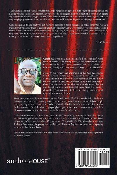 The Masquerade Ball is Gerald's fourth book of poetry; it's a collection of both poems and some expressions dealing with life issues. Like the first three books, this book again explores aspects of life that most people shy away from. Besides being a tool for dialog between mature adults, it dives into that deep subject as to why people play games with one another and the tricks folks use to disguise true feelings or intentions. Gerald continues to use poetry to get his views across to a broad audience in hopes some will receive a message that will allow them to grow intellectually and spiritually. Over the past few years, he has learned that many individuals have been turned away from poetry by the simple fact that they don't understand it, they can't relate to it, or that it serves no purpose in their lives. Gerald has resolved those types of issues by making his brand of poetry easy to read and comprehend. G. W. Jones