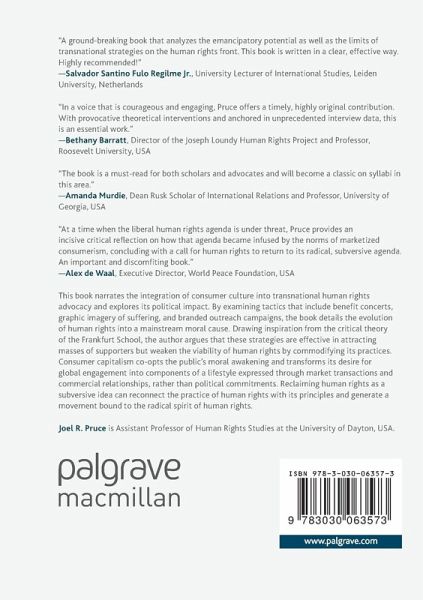 This book narrates the integration of consumer culture into transnational human rights advocacy and explores its political impact. By examining tactics that include benefit concerts, graphic imagery of suffering, and branded outreach campaigns, the book details the evolution of human rights into a mainstream moral cause. Drawing inspiration from the critical theory of the Frankfurt School, the author argues that these strategies are effective in attracting masses of supporters but weaken the viability of human rights by commodifying its practices. Consumer capitalism co-opts the public's moral awakening and transforms its desire for global engagement into components of a lifestyle expressed through market transactions and commercial relationships, rather than political commitments. Reclaiming human rights as a subversive idea can reconnect the practice of human rights with its principles and generate a movement bound to the radical spirit of human rights.